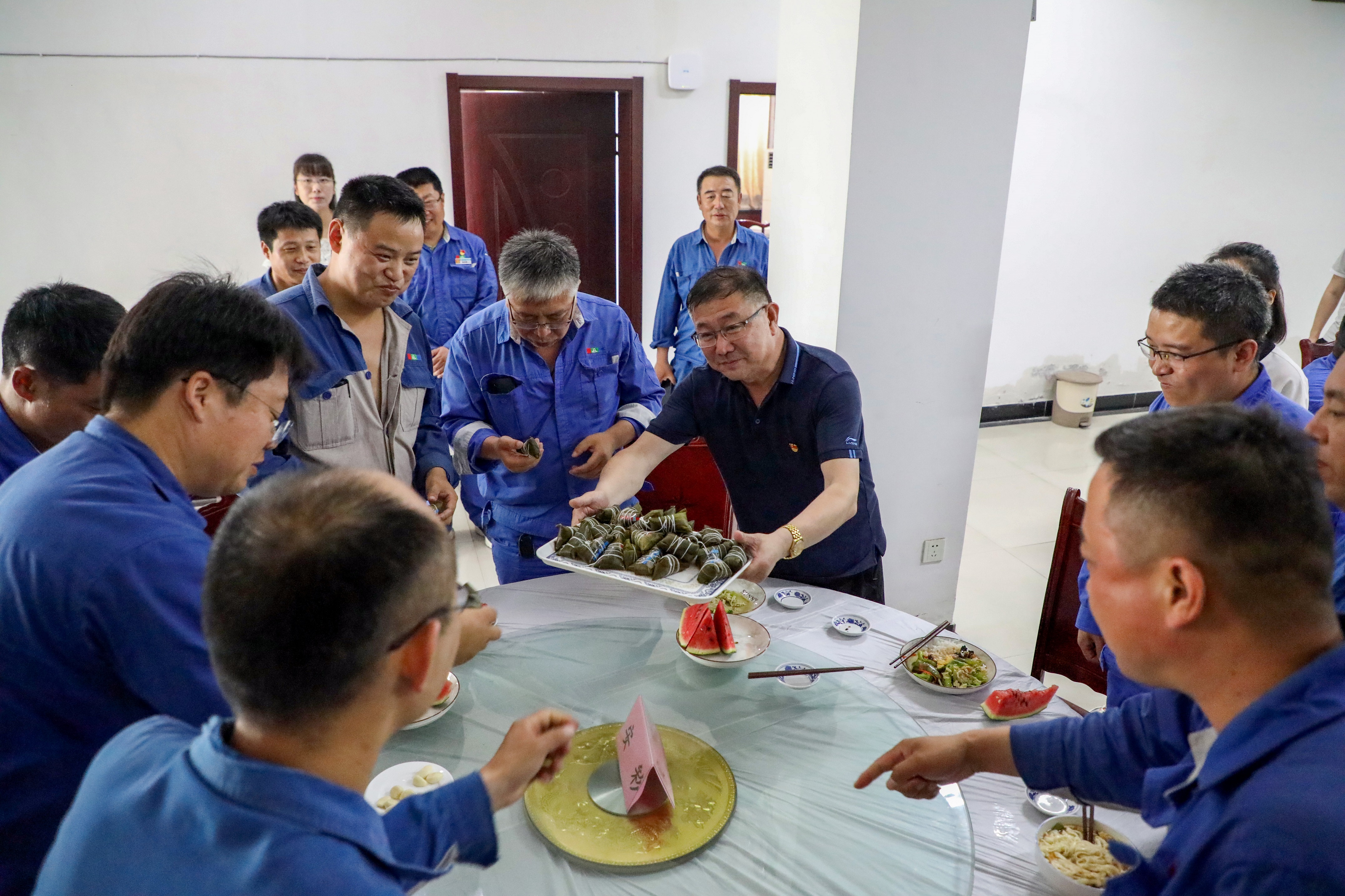 為搶抓工期、趕超進度,安彩焦作項目部建設人員的端午節將在堅守崗位中度過。中午,呂書記來到餐廳,為前來就餐的職工送上粽子,把公司黨委和工會的溫暖送到職工們的心坎上,讓每一位遠在異鄉的職工都感受到公司“大家庭“的關心和節日的問候,大家深受感動和鼓舞。